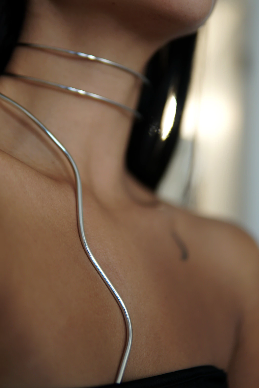 sabe aquela vibe futurista? é o que o aro espacial tráz. além de preencher seu pescoço com dois fios milimetricamente calculados, deixa a produção muito mais interessante.