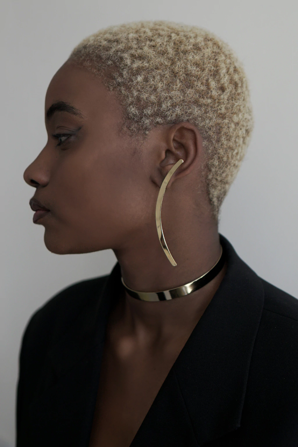 elegância e rebeldia. deixa o rosto emoldurado, como uma obra de arte. brinco alongado, futurista, que conta uma hisória pra quem olha pra ele.